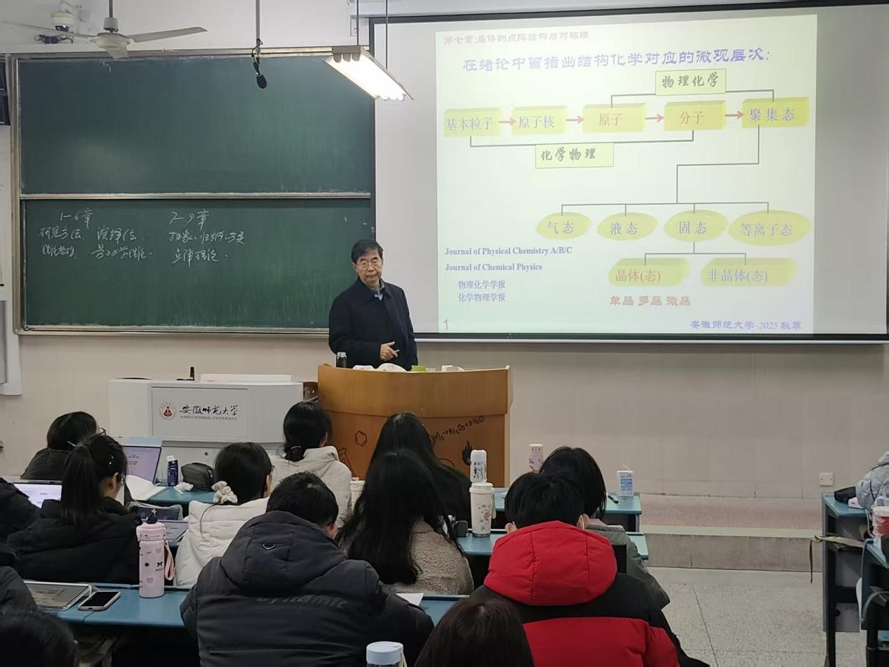 本网讯 (化材学院 郭雨涵) 12月4日,化材学院王文亮老师在花津校区行知楼3号楼2030103教室为2023级化学(师范)专业1、2、7班全体同学讲授了一场精彩的结构化学示范课。学院教学副院长、教学督导组、部分专业教师前来观摩听课。